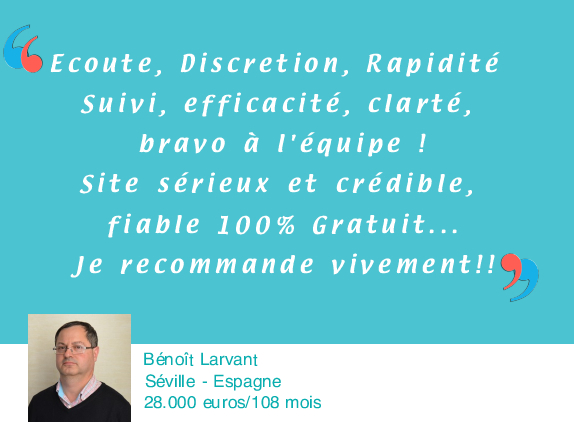 Bjr, avec mon mari, on cherchait un rachat de crédits sérieux sans arnaques, à un taux compétitif et nous avons reçu l’offre de ce site par mail. Mais contrairement à tous ces faux sites qui vous demandent toujours de l'argent, ou ces faux prêteurs qui nous envoient des messages chaque jour, ils nous ont proposé un regroupement de crédits très abordable avec une mensualité très basse qui...