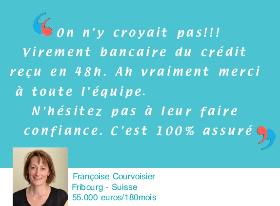 Au départ, moi je n'y croyais pas du tout à leur pub car avec la crise, pour obtenir un prêt auprès des banques ou des organismes de crédit, c'est mission impossible et pourtant ils nous abreuvent de publicité. Et j'ai reçu un avis de ma banque qui m'annonce que le virement sera validé en 24h. Là j'étais sur le ****. Avec ce site...